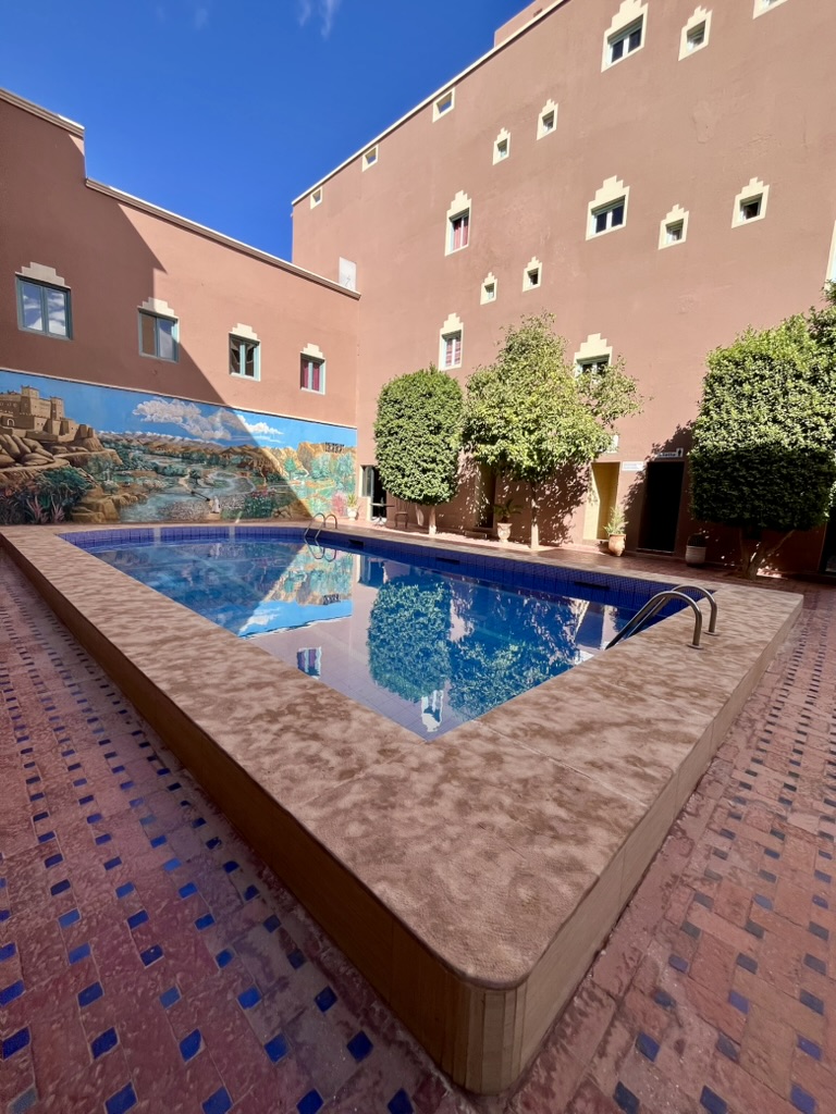 Il reste autour du grand bassin un bel espace pour des tables et des chaises longues. Des arbres ont été planté, et un mur élevé sépare la piscine de la rue. Avec L’ombre que les arbres procurent, c’est l’endroit idéal pour passer une après-midi de tranquillité au retour d’un voyage dans le désert. Vous alternerez entre séance bronzage et séance fraîcheur dans l’eau, en sirotant un jus d’orange frais tout juste pressé ou un thé à la menthe.